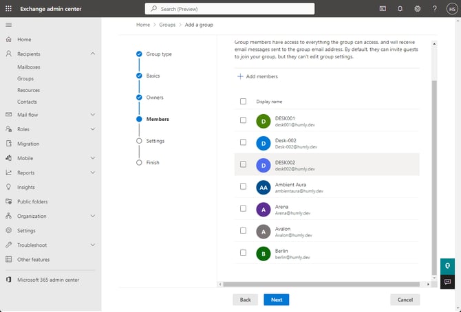 3. Create Senders Group: Repeat the previous two steps, but instead of adding resources, add the users you want to use in the Humly Control Panel for sending email notifications. One user should be enough, but you can add more if you want.