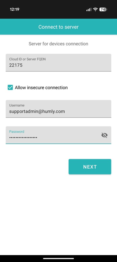 2. Start the provisioning application on your mobile device. Enter your Cloud ID, or if you are using an on-premises setup, provide your server URL along with the appropriate port number (e.g., win22-6.sss.ce:3002). Input the credentials for the Humly Control Panel global admin account, then select Next to proceed.