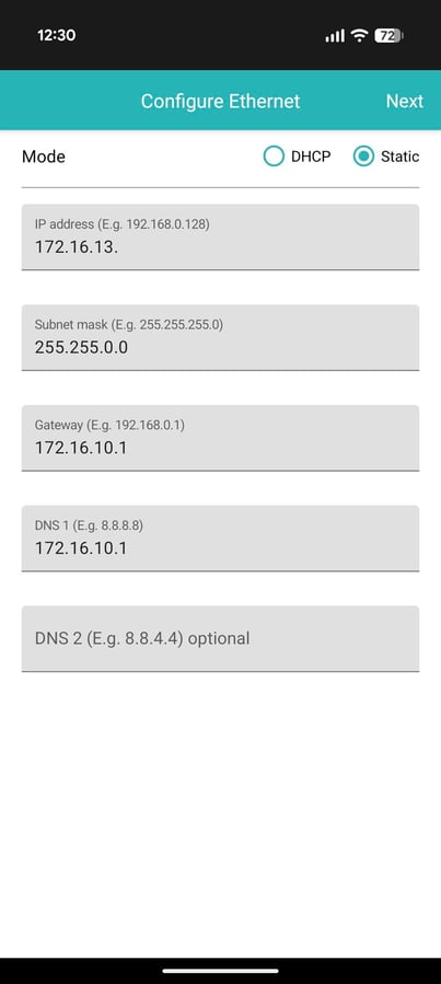 6. A screen will appear prompting you to select an Ethernet configuration. Choose either DHCP or Static IP based on your network setup. If you prefer not to use Ethernet, select DHCP and then click Next; you will have the option to configure Wi-Fi in the subsequent step.