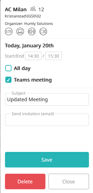 Note: You can only modify bookings that you created, unless the resource settings allow users to edit or delete any meeting without authentication.