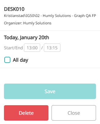 Deleting or modifying a booking follows the same procedure as for rooms and desks: