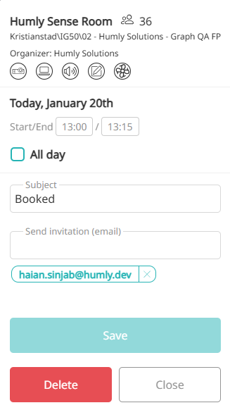 - Click the Delete button to cancel the booking, or edit the meeting details and click the Save button.