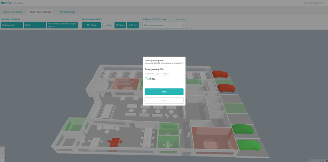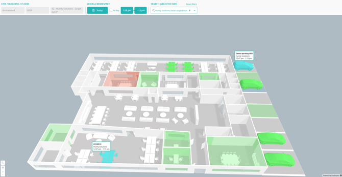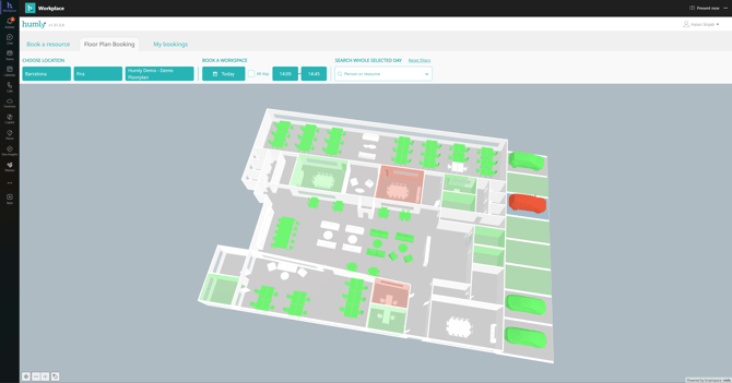 Humly Floor Plan allows you to visualize your workspace in real-time and manage room, desk, and parking space bookings through an interactive 3D floor plan interface.