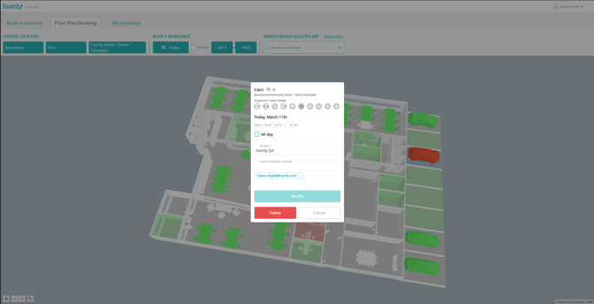 Once you select the email, the booking/resource will be marked in the floor plan, with an indicator including the resources that have been booked, the start and end time of each booking