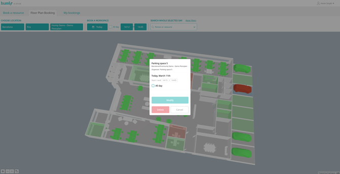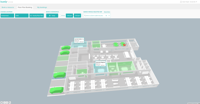 - To book a resource from Humly Floor Plan, choose which day and date on which you want to book a resource. Click on an available resource and the booking dialog will popup.