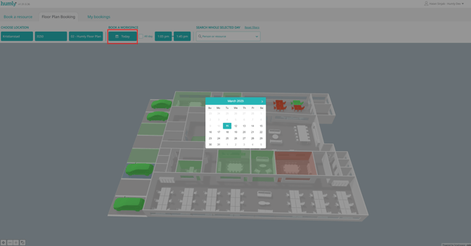 Use the calendar and location filters to find available rooms, desks, or parking spaces.