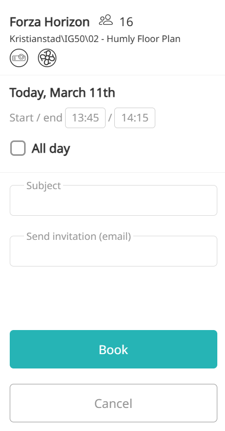 - Cancel and Book - Adjust the start and end time and set a subject for your booking. If you want an email to be sent when a booking has been done you can fill in the field and press enter. You can add as many emails as you want. Click Book to confirm the booking and sync it to the room’s Humly devices and the resource calendar in booking system like M365.