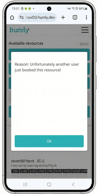 - An error or status modal indicating the resource is "Already Booked" or busy