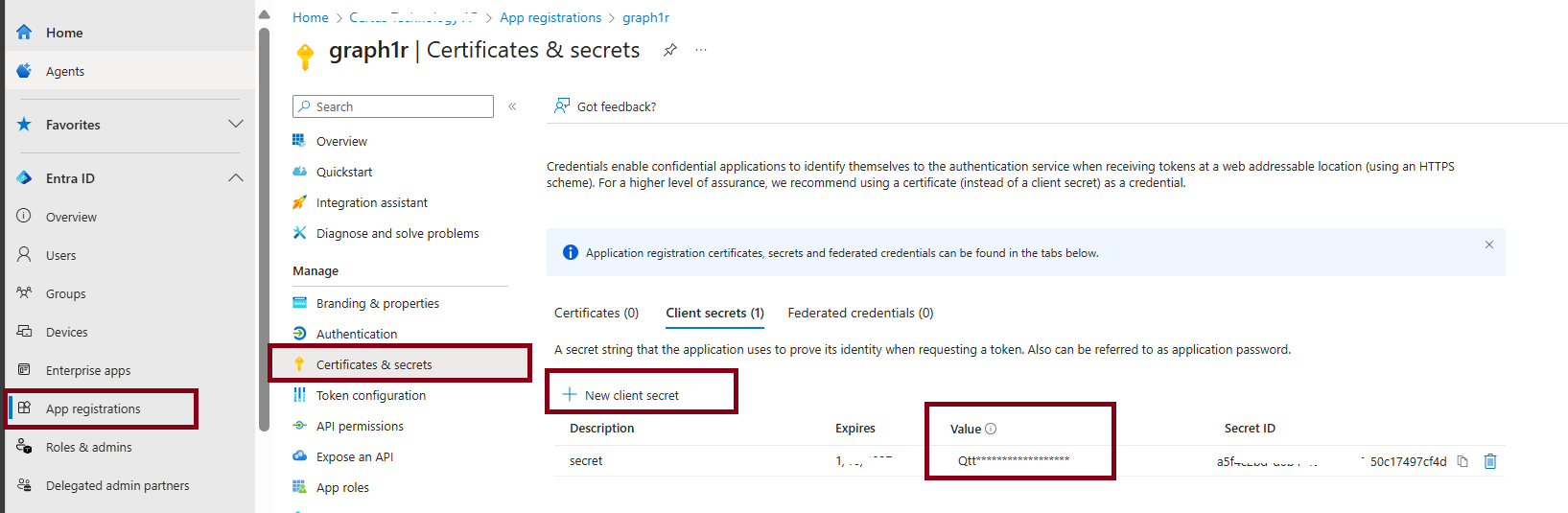 Copy the VALUE of the newly created client secret and NOT the SECRET ID