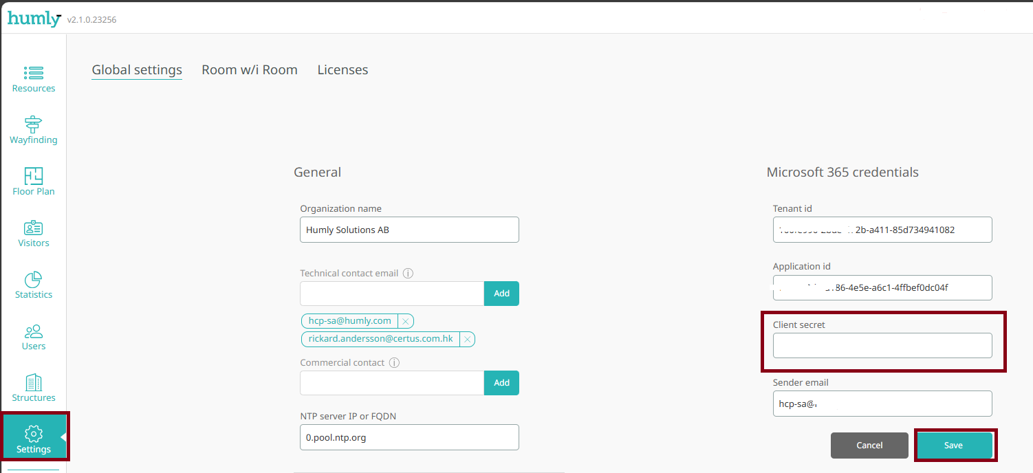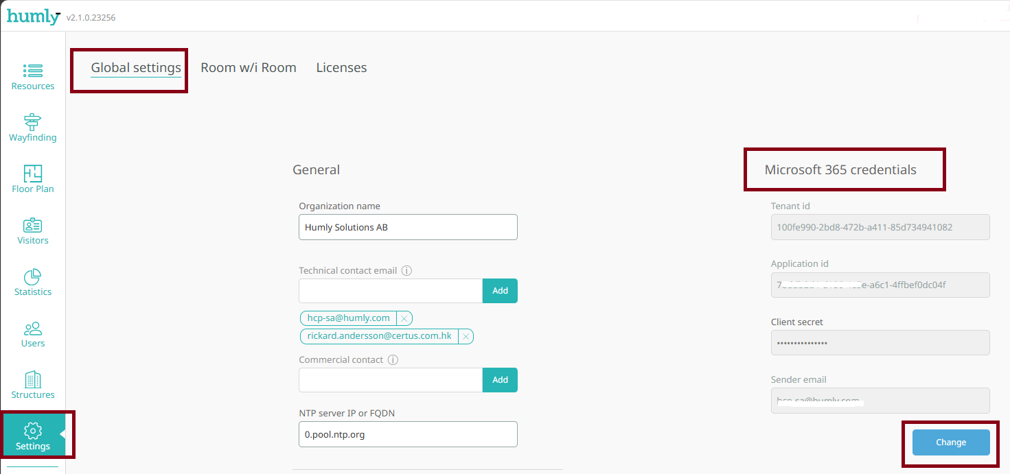 Go to the Humly Control Panel Global settings (settings > global settings), and click on change as seen below: