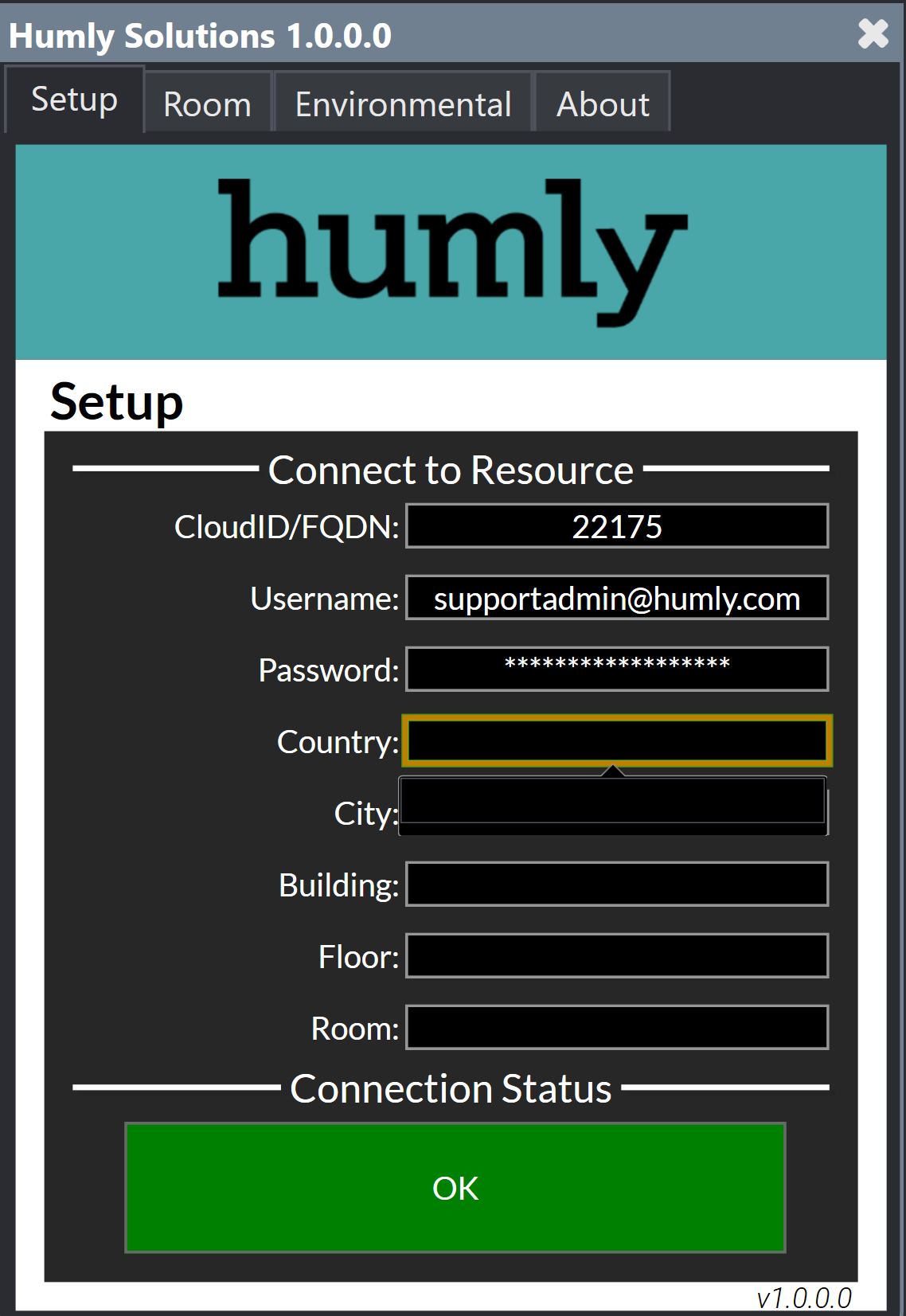 for example: 12345, or your-hcp.domain.com - Username: The user name of a Humly Control Panel Global Admin