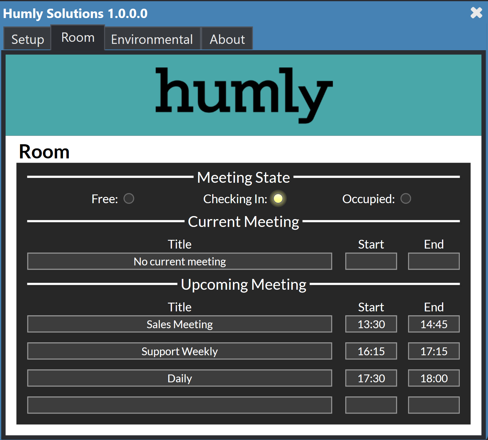 - Once the resource is configured, Q-SYS plug-in should be able to fetch the meeting and room status from Humly Control Panel